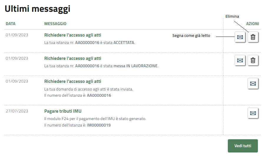 Ultimi Messaggi: raccolta degli ultimi messaggi ricevuti dall'Amminsitrazione in merito alle istanze presentate