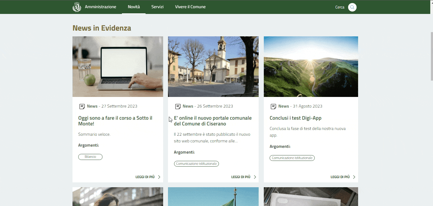Come suggerisce il nome della sezione, all'interno di questa pagina troverete tutte le novità del Comune, ovvero le news pubblicate, i comunicati stampa e gli argomenti tramite i quali potrete accedere velocemente ai contenuti raccolti per macrocategorie.