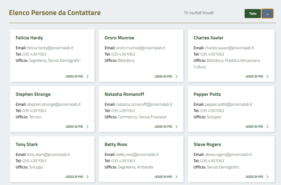 Com'è fatto il sito?Amministrazione Personale Amministrativo In questa sezione sono presenti tutti i Dipendenti Comunali, ordinati in ordine alfabetico. E' possibile filtrare i risultati cliccando sui tre puntini in alto a destra, inserendo i parametri indicati