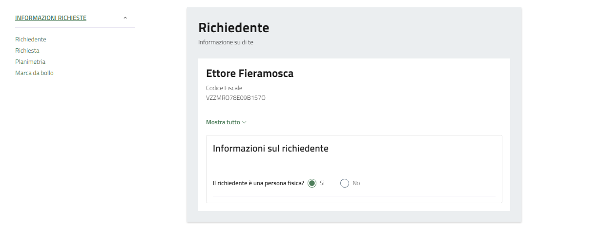 Indicare per conto di chi o cosa si sta presentando l'istanza.