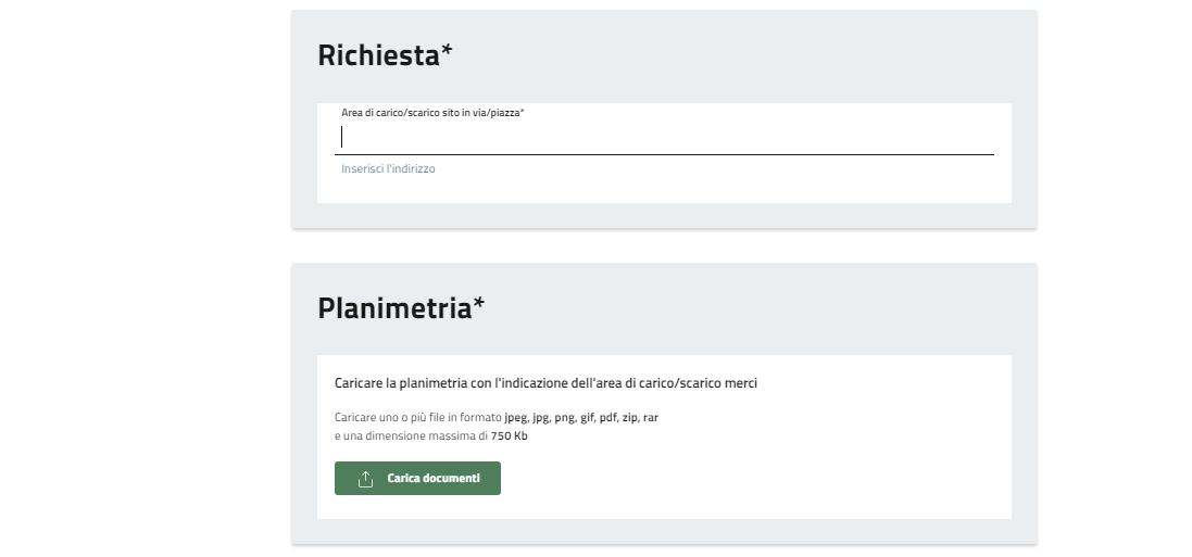 Il primo passo per richiedere la realizzazione di un'area di carico/scarico merci, è l'accettazione dell'informativa privacy.