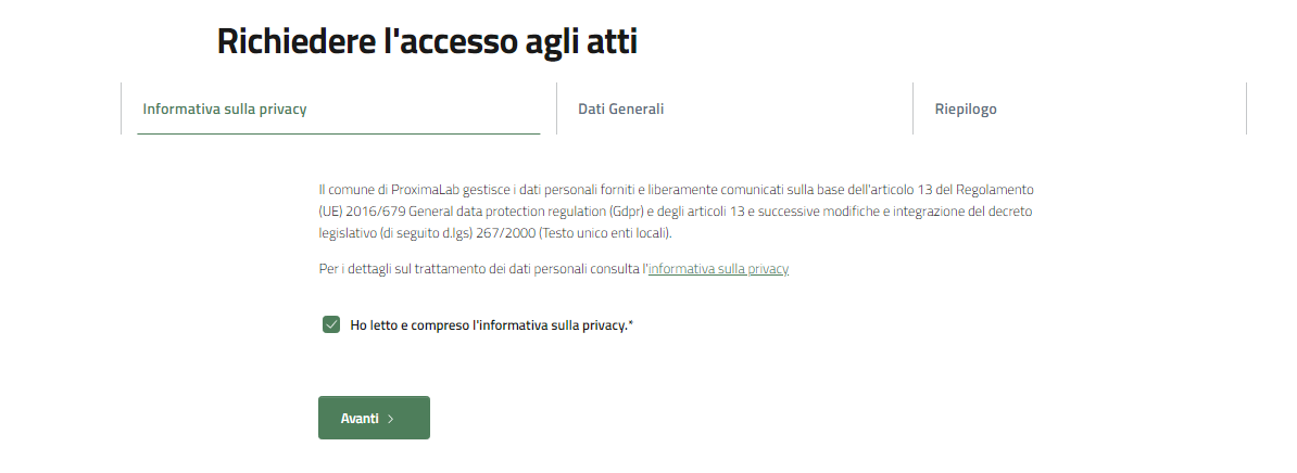 Il primo passo per richiedere l'accesso agli atti, è l'accettazione dell'informativa privacy.