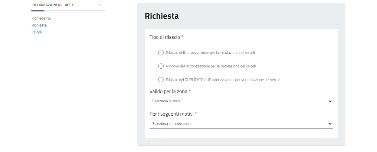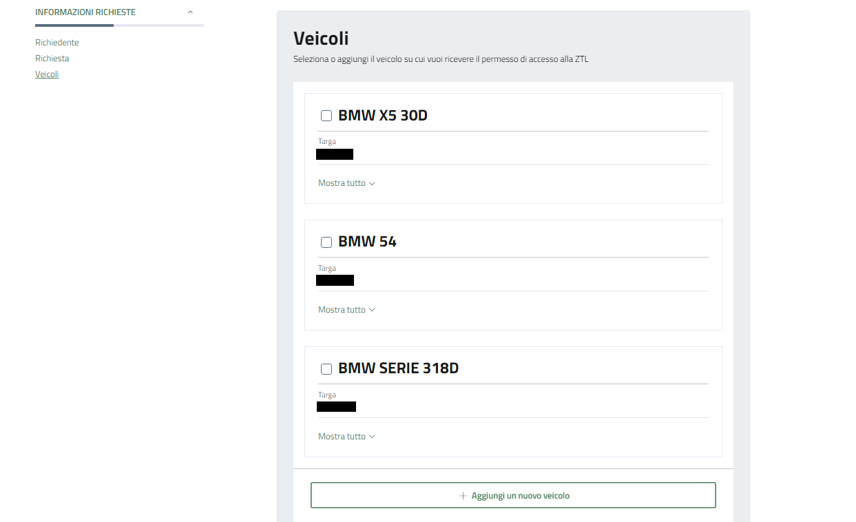 Flaggare il veicolo per la quale si vuole richiedere il permesso.