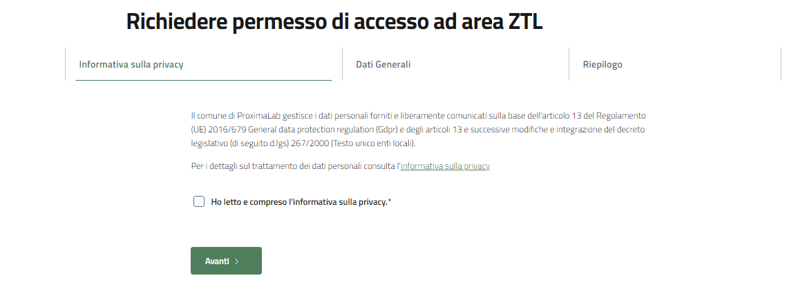 Il primo passo per richiedere il permesso di accesso ad una ZTL, è l'accettazione dell'informativa privacy.