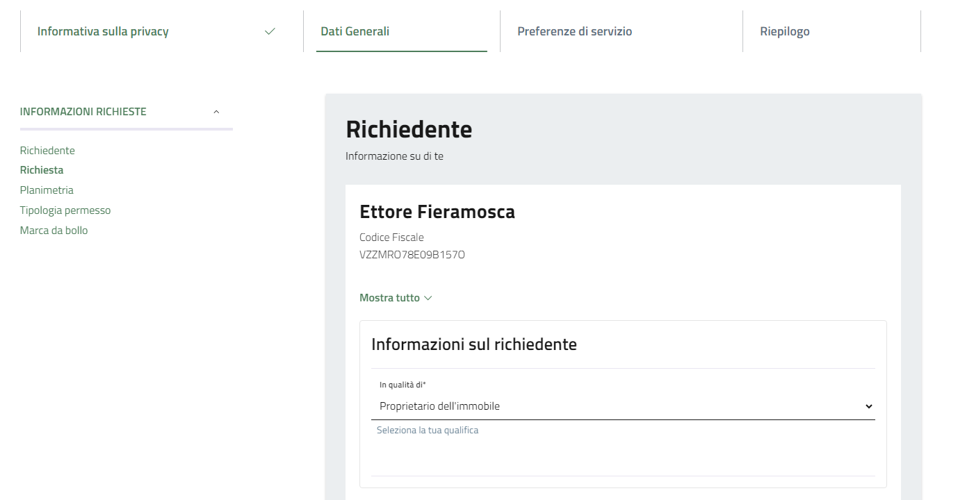 Indicare per conto di chi o cosa si sta presentando l'istanza