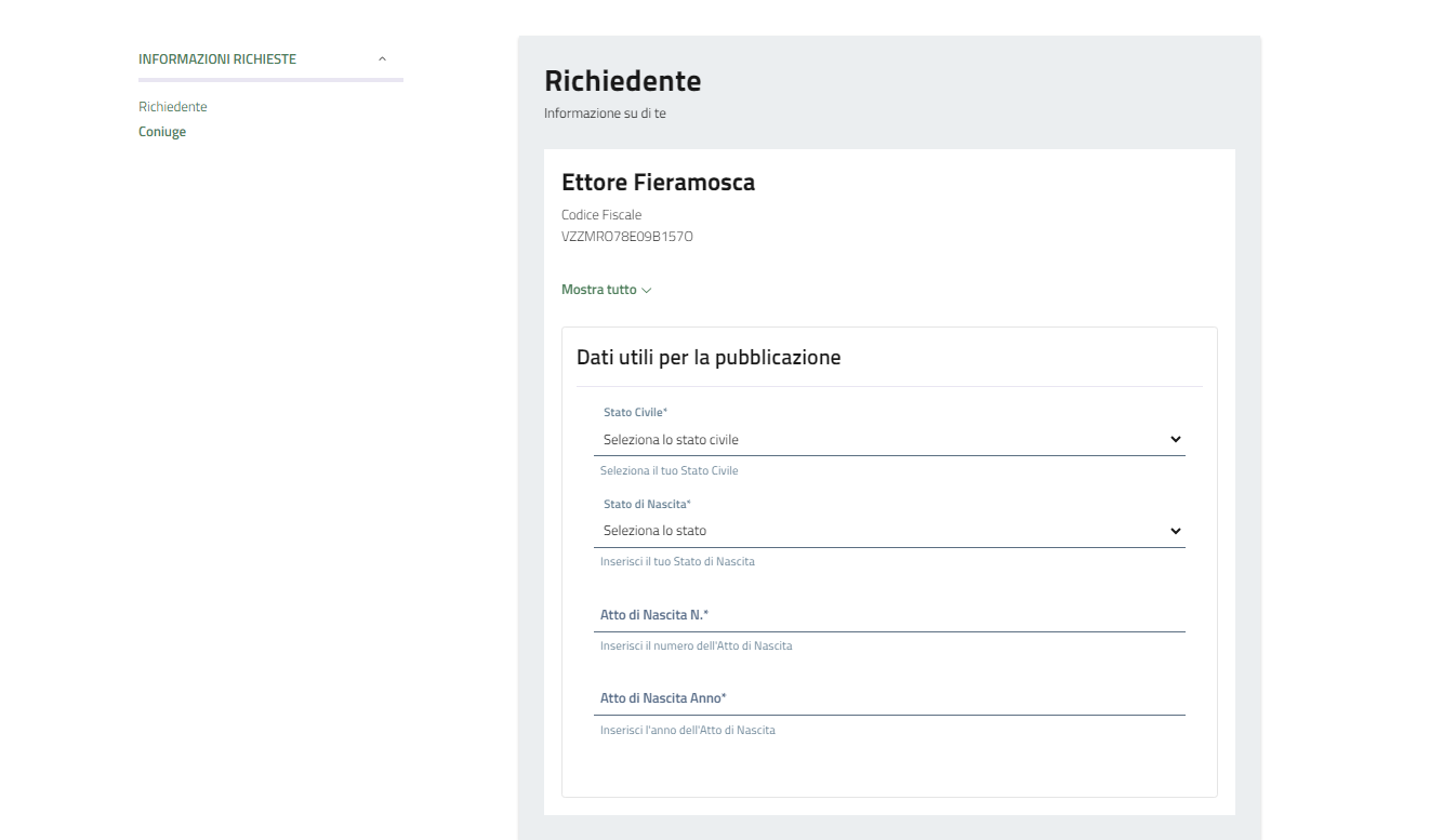 I dati del coniuge possono essere compilati dalla persona che ha effettuato il primo accesso, oppure compilati direttamente dal coniuge dopo avere inviato la richiesta.