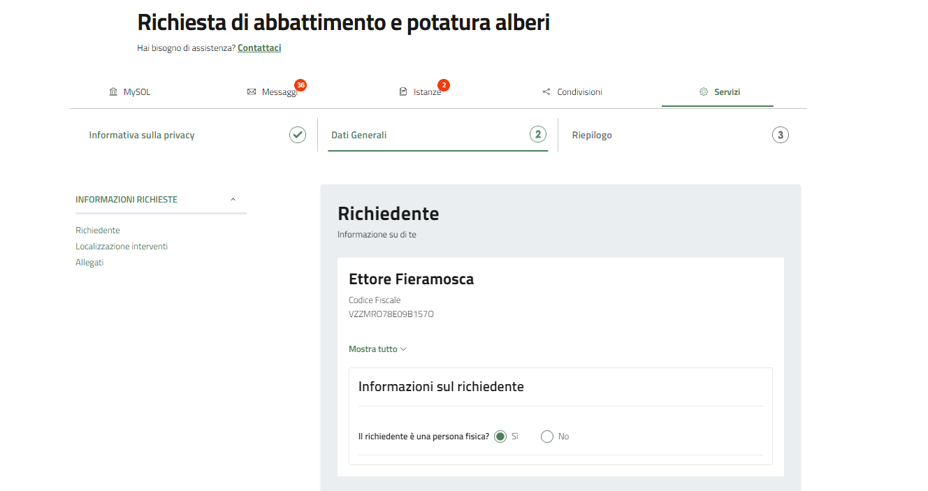 Il primo passo per richiedere l'abbattimento o la potatura degli alberi, è l'accettazione dell'informativa privacy.