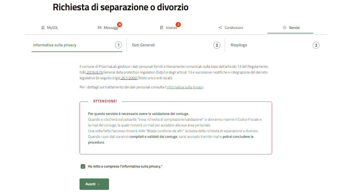 Il primo passo per richiedere la separazione o il divorzio, è l'accettazione dell'informativa privacy.