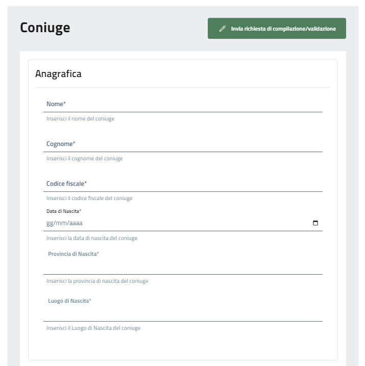 Dopo aver compilato i dati, o volendo farli compilare in toto al coniuge, cliccare su "Invia richiesta di compilazione/validazione".