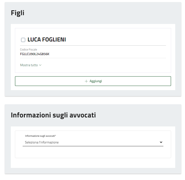 Indicare l'anagrafica dei figli nel caso vi siano. Se già configurati nella propria area personale compariranno automaticamente, in alternativa, aggiungerli mediante il pulsante "Aggiungi"